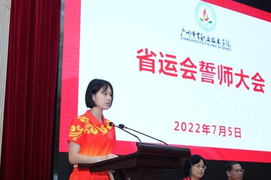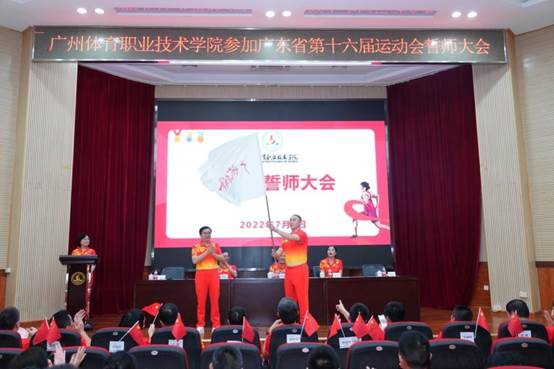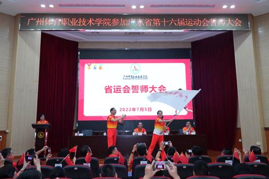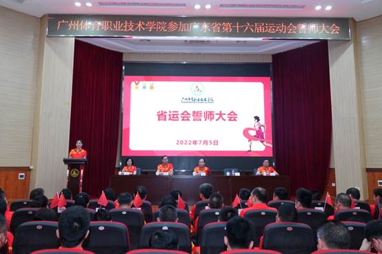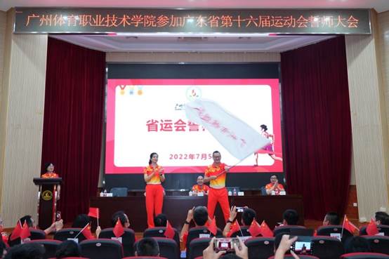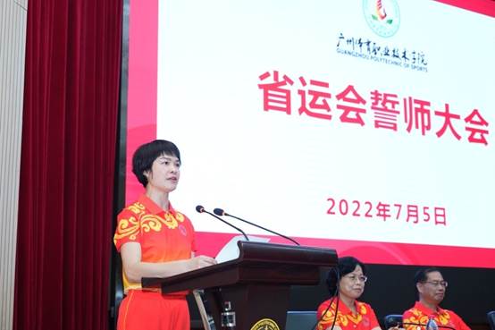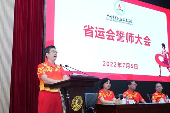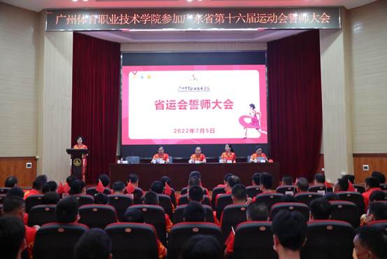 本网讯 7月5日上午,距离广东省第十六届运动会竞技体育组第一个项目开赛倒计时7天之际,广州体育职业技术学院召开广东省第十六届运动会参赛誓师大会。市体育局党组书记、局长欧阳资文,学院党委书记谭爱英,院长李国平,纪委书记林昭雄,副院长张苹,局机关有关处室负责人,学院相关职能部门负责人及各运动队全体人员、运动员代表参加。会议由张苹主持。