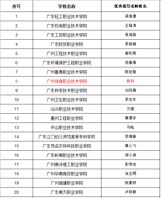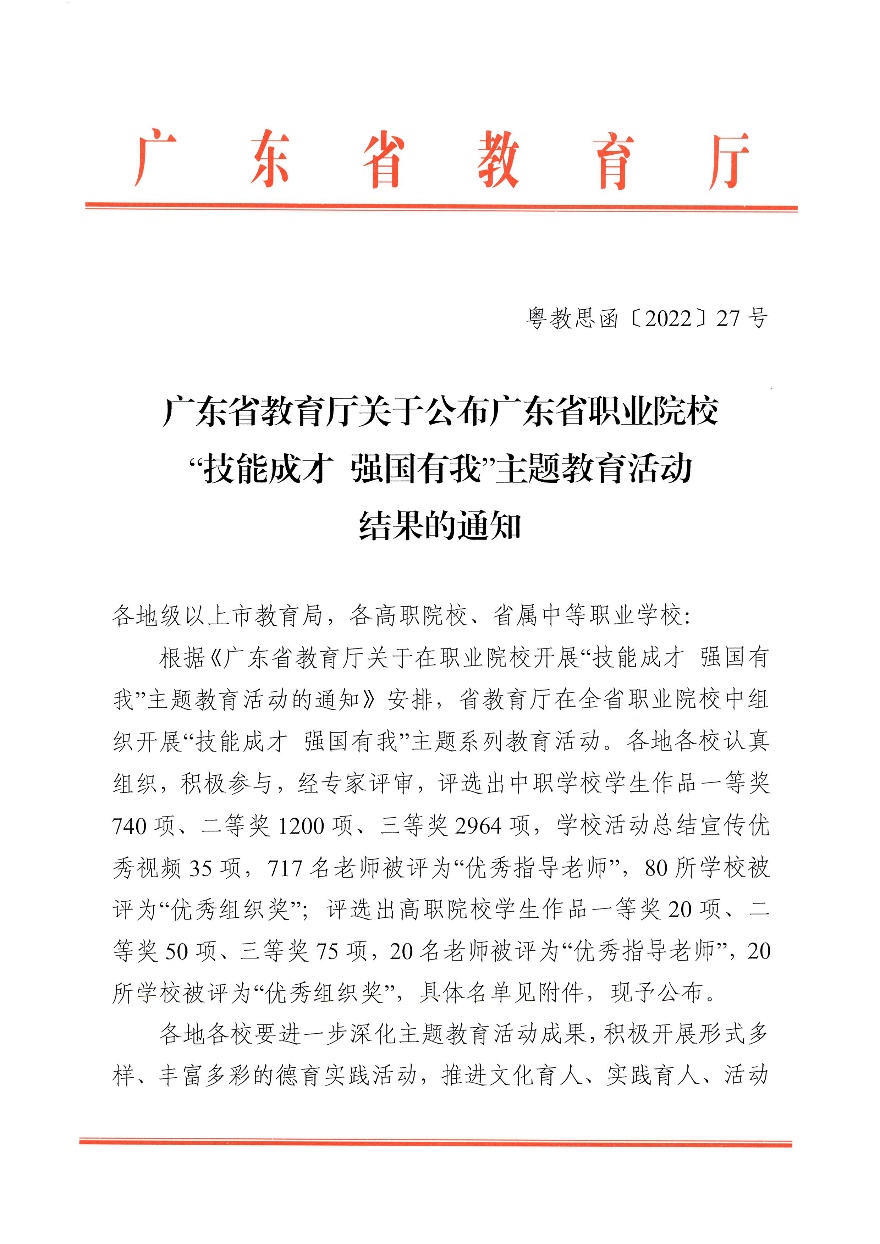 本网讯 日前,广东省教育厅公布了广东省职业院校“技能成才 强国有我”主题教育活动获奖结果。广州体育职业技术学院认真组织,积极参与,活动经征集、省教育厅评选等环节,学院获评优秀组织奖,有2部作品脱颖而出分获一等奖和三等奖,1名老师获评优秀指导老师。