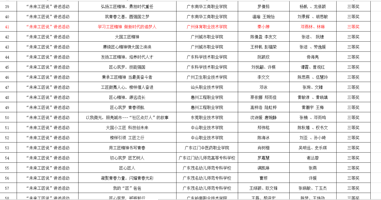 为进一步弘扬“工匠精神、劳动精神、劳模精神”,教育引导学生衷心拥护党的领导和我国社会主义制度,培养爱国之情、砥砺报国之志,走技能成才、技能报国之路,履行好“请党放心,强国有我”的庄严承诺,广东省教育厅主办了“技能成才 强国有我”主题教育活动。学院踊跃参与,组织力量认真创作视频作品,最终体育产业系学生莫观明、体育运动系学生吴景辉参加,陈利老师指导的“传承冠军精神 铸造体育强国”视频作品荣获“榜样故事我来说”讲述活动一等奖;体育产业系学生秦小婷参加,邓燕林、林琳老师指导的“学习工匠精神 做新时代的追梦人”视频作品荣获“未来工匠说”讲述活动三等奖;陈利老师获得主题教育活动“优秀指导老师”称号。