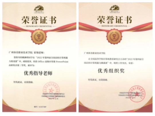 本网讯 近日,2022年第四届全国高校计算机能力挑战赛决赛传来佳绩。由广州体育职业技术学院学生与来自全国各地的高校1200多支队伍同台竞技,斩获全国二等奖1项、全国三等奖4项,郑路老师和崔翔老师分别获得3项和2项优秀指导教师奖,学院获得优秀组织奖。