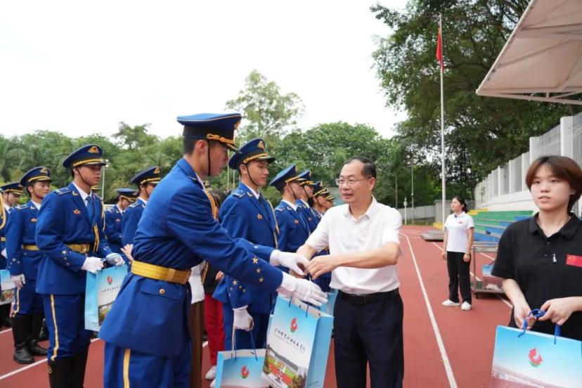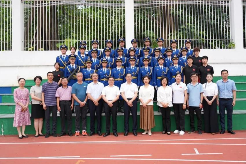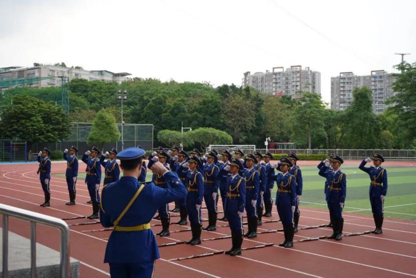 本网讯 第三届广东省学校国防教育成果交流展示活动将于5月17日-20日在清远举行。5月11日下午,广州体育职业技术学院在东校区田径场举行了国旗护卫队出征仪式,为学院国旗护卫队出征壮行、加油助威。学院院长李国平、党委副书记黄丽仪、纪委书记林昭雄、副院长张苹、副院长崔明,办公室(党办)、宣传处、教务处、学生处、体育运动系、体育产业系、体育保健与康复系、信息中心、团委等部门负责人、师生代表和国旗护卫队全体队员参加了仪式。