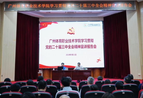 本网讯 为深入学习贯彻党的二十届三中全会精神,9月11日下午,广州体育职业技术学院在西校区阶梯会议厅举办党的二十届三中全会精神宣讲报告会。市委宣讲团成员、华南师范大学马克思主义学院院长关锋教授作党的二十届三中全会精神宣讲报告。学院院长李国平、党委副书记黄丽仪、纪委书记林昭雄、副院长张苹、副院长崔明,副处级以上领导干部以及全体在职党员参加。会议由院长李国平主持。