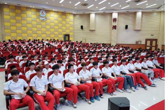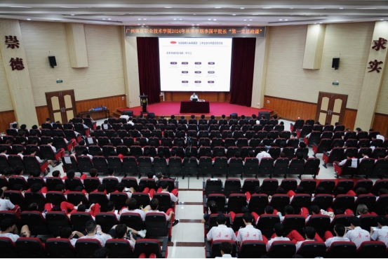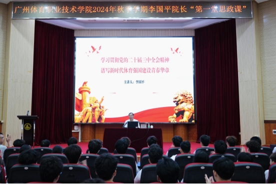 本网讯 9月26日上午,广州体育职业技术学院院长李国平以“学习贯彻党的二十届三中全会精神 谱写新时代体育强国建设青春华章”为题讲授2024年秋季学期“第一堂思政课”。2023级、2024级部分高职学生,全体思政课教师和辅导员近300人在西校区阶梯会议厅共同聆听了授课。