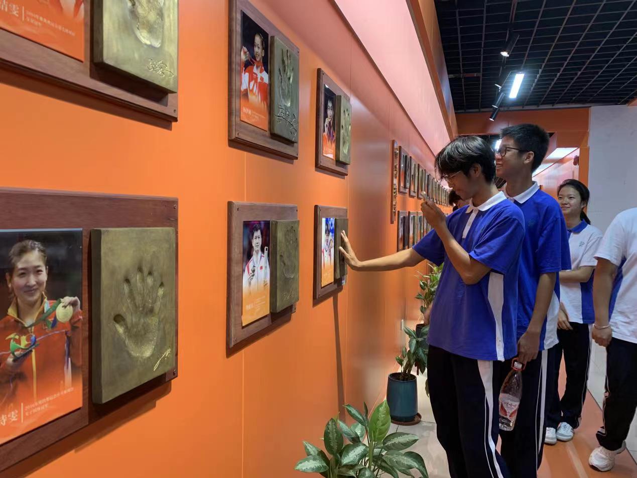 学生仔细聆听讲解员介绍学院培养输送的奥运冠军、世界冠军