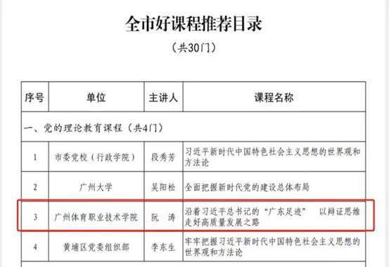 本网讯 近日,广州市委组织部公布《广州市干部教育培训好课程推荐目录》,广州体育职业技术学院思想政治理论课教学部阮涛老师主讲的《沿着习近平总书记的“广东足迹”,以辩证思维走好高质量发展之路》成功入选2024年广州市干部教育培训30门好课程之一,现已在广州市干部培训网络学院(https://gzgbjy.gzswdx.gov.cn/)正式上线。此次好课程成功申报,标志着学院思政课教师的执教能力、研究能力、服务能力等综合素质得到显著提升。