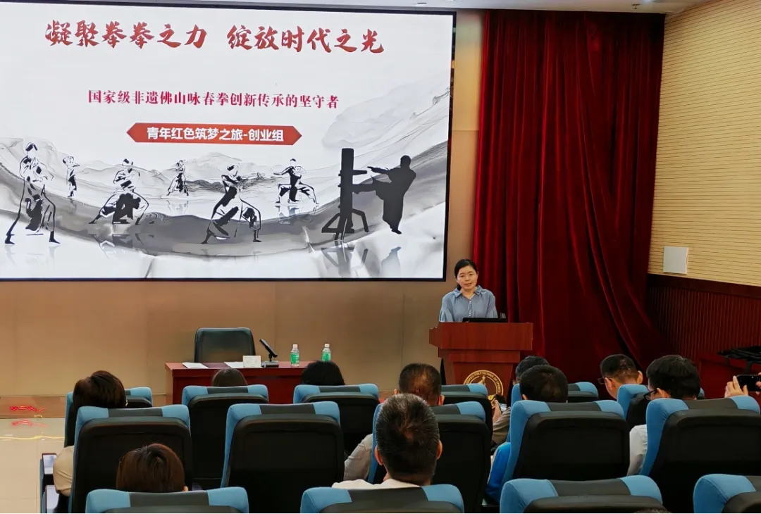 为发挥榜样示范作用,大会还安排了体育产业系张艳美老师作中国国际大学生创新创业大赛省赛经验分享。在刚刚结束的2025年中国国际大学生创新创业大赛广东省分赛中,由张艳美、丁双凤老师指导的项目《凝聚拳拳之力,绽放时代之光——国家级非遗佛山咏春拳创新传承的坚守者》斩获“青年红色筑梦之旅”赛道金奖,实现了学院在该项赛事的历史性突破。