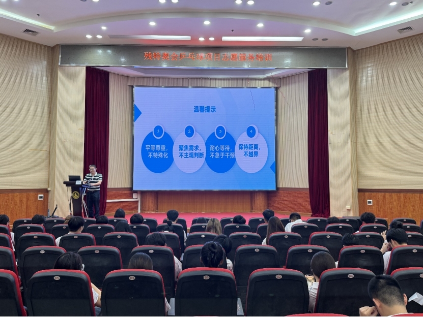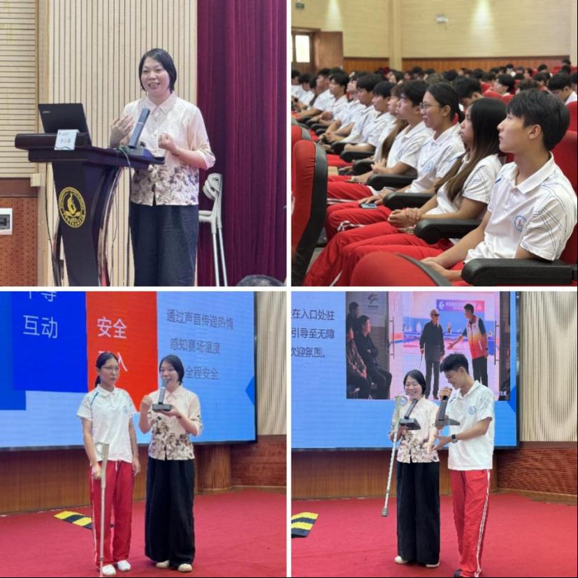 培训伊始,残特奥会乒乓球(大众组)竞赛委员会副主任、学院副院长张苹率先作动员讲话。她以“以爱之名,专业护航”为主题,深刻阐述了本次赛事的特殊意义与社会价值。“每一位残疾运动员都是突破自我的生命勇者,我们的服务不仅要体现效率与规范,更要让温暖渗透到每个细节。”张苹结合往届赛事案例指出,志愿者作为赛场的“第二形象大使”,需兼具敏锐洞察力与共情能力——既要精准识别运动员的需求信号,又要维护其独立尊严;既要做好流程化的服务衔接,又要灵活应对突发状况。她特别强调:“你们的一个微笑、一次搀扶、一句鼓励,都可能成为改变运动员参赛体验的关键。”这番话如同火种,瞬间点燃了在场志愿者的使命担当。