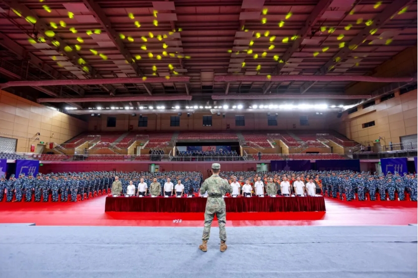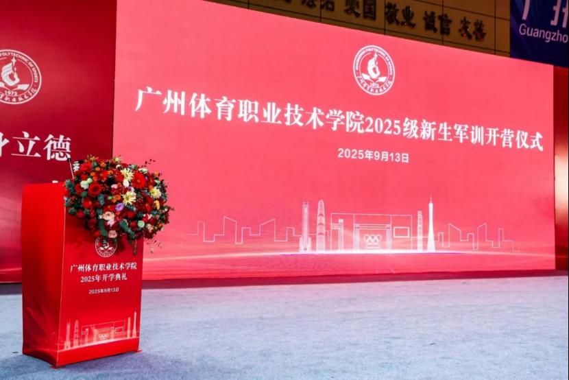 本网讯 2025年9月13日上午,广州体育职业技术学院2025级新生军训开营仪式在东校区体育馆举行。学院副院长张苹、95007部队中校副参谋长唐啸、各系党总支书记、学生处负责人、承训教官及全体参训新生参加仪式。仪式由学生处处长邓娉主持。