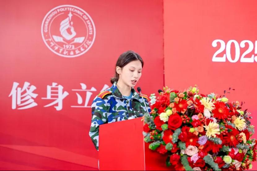 2025级运动训练专业邓川幸同学代表全体新生发言并领誓,承诺将发扬"不怕苦、不怕累"的精神,认真完成各项训练任务,以实际行动践行"请党放心,强国有我"的青春誓言。