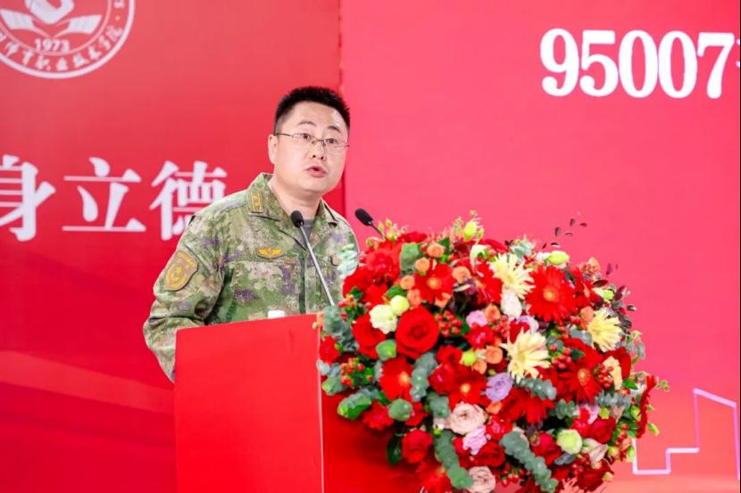 95007部队中校副参谋长唐啸作开训动员讲话。他希望同学们充分认识军训重要意义,以军人标准严格要求自己,服从命令、刻苦训练,增强国防观念,锤炼意志品质。