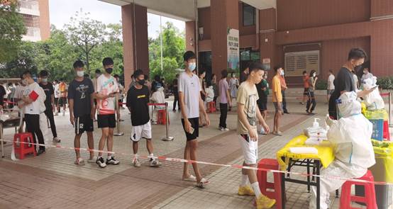 检测开始,支部志愿者们穿上防护服,戴上红袖套,既当疏导员,又当讲解员,分工协作,密切配合,认真细致地做好信息采集、秩序维护、防护提醒等工作。检测现场文明有序,所有人员自觉排队、戴口罩、保持安全距离、不喧哗,不少师生还不忘向医护人员和志愿者们表示感谢,用实际行动践行文明风尚。
