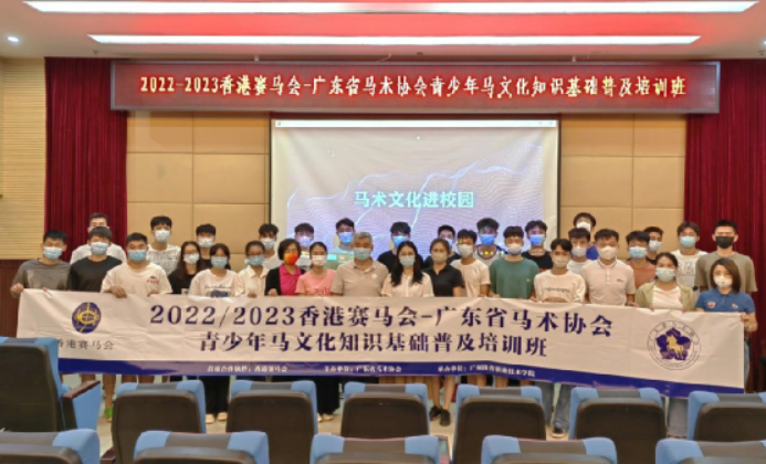 本网讯 10月27日,由广东省马术协会、香港赛马会主办的2022/2023青少年马文化知识基础普及班在广州体育职业技术学院图书馆一号报告厅举行,体育产业系党总支书记林文戈、休闲体育教研室全体教师及2021级休闲体育专业全体学生、广东省马术俱乐部的裁判、教练参加本次讲座。