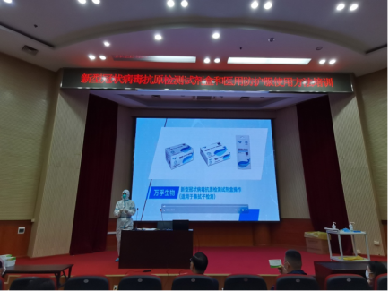 培训会上,学院医务所医生通过观看视频、理论讲解和实践操作,为全体人员讲述了新冠抗原检测剂盒使用和医用防护服穿脱的基本要求、操作流程及注意事项等,并以“试-学-练”的互动方式进一步巩固了培训效果。