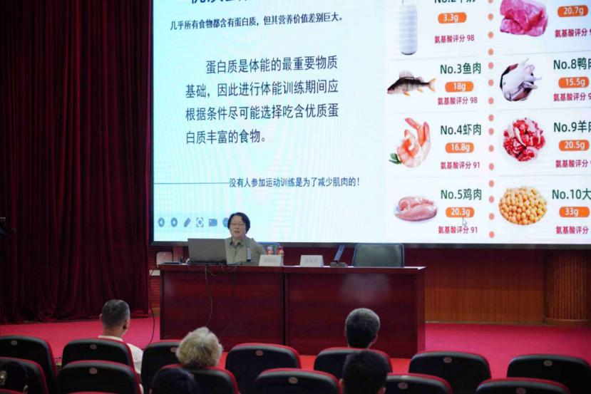 在培训过程中,徐晓阳教授紧扣“青少年运动员吃什么?如何吃?”这一核心议题,进行了系统且深入的讲解。她首先从人体能量与营养基础入手,详细阐述了人体能量获取与利用的机制,以及各类营养素的概念、功能和食物来源,为在场人员构建了坚实的营养知识框架。在合理营养与运动的板块中,徐教授深入讲解了合理营养的标准与原则,并通过实际案例生动展示了合理营养对提升青少年运动员运动能力的显著作用。针对青少年运动员的关键营养素需求,徐教授明确了糖、脂肪、蛋白质等营养素的合理摄入量及其对健康的影响。在科学补液要点方面,她细致讲解了青少年运动员在运动各阶段的补液策略,包括补液的种类、量和时间,并着重强调了脱水对运动表现的潜在危害。此外,徐教授还针对有氧耐力和力量训练等专项运动,介绍了相应的营养补充方法和食物选择,并深入分析了运动前、中、后三个阶段的营养补充要点及最佳时机,为教练员们提供了极具实践价值的指导。