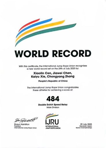4×30秒单摇接力项目中,学院岑小林、张崇杨、谢凯宇与花都跳绳队张桂源联合组队,在决赛中以860次的优异成绩强势夺冠,一举刷新了该项目的世界纪录,让世界见证了中国跳绳的硬核实力!中国跳绳国家队广州体职院代表队在两项接力赛事中接连夺冠,用实力诠释了“速度与配合”的完美结合,成为赛场上当之无愧的双冠王组合。