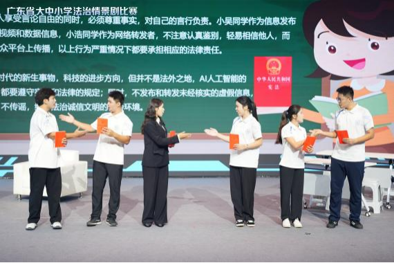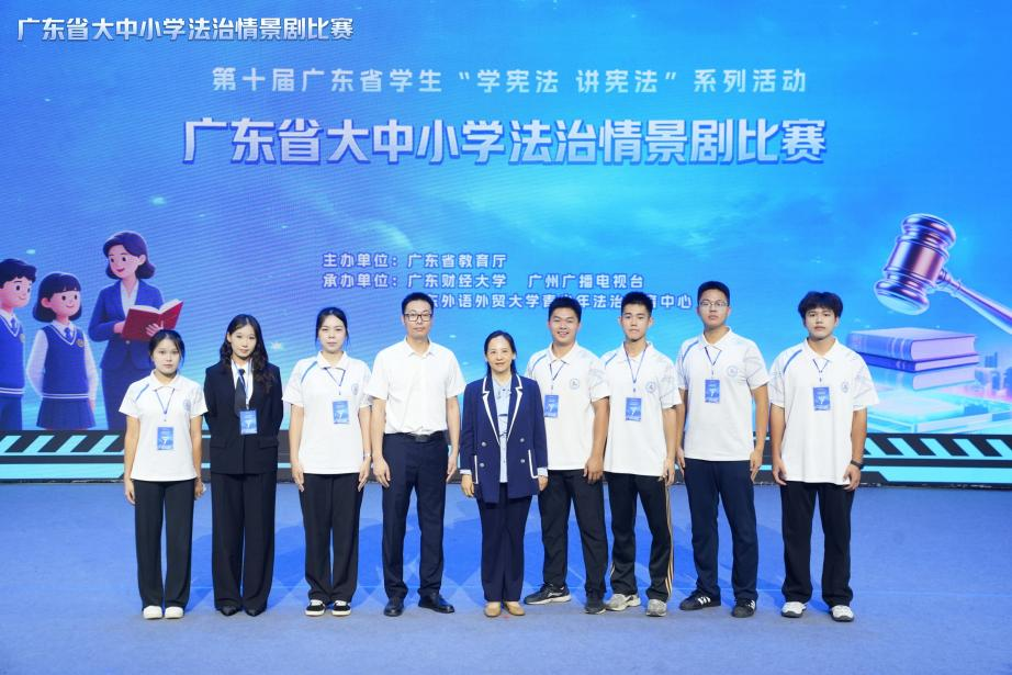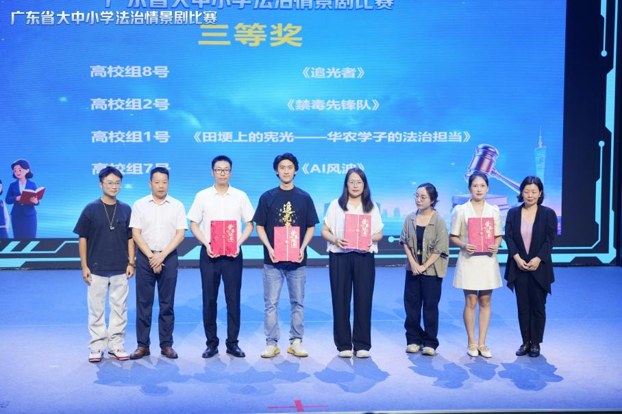 本网讯 8月31日,广东省教育厅主办的第十届广东省学生“学宪法 讲宪法”系列活动之大中小学法治情景剧复赛落下帷幕。在广州体育职业技术学院体育产业系丁丽梅副主任、廖威老师的指导下,由黎江华、黄馨怡、颜国浩、刘成海、吴诚、陈雪楠、谢文浩同学组建的参赛团队,凭借精心编排的法治情景剧《AI风波》,将宪法知识与鲜活的校园生活场景融合,最终荣获高校组三等奖,为学校赢得了荣誉,也展现了体职院学子在法治素养与艺术表演上的双重风采!