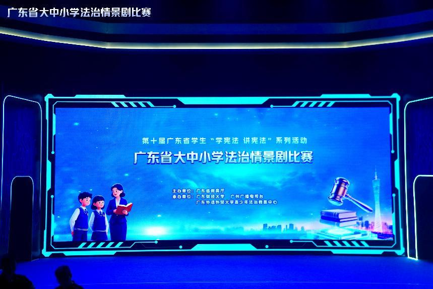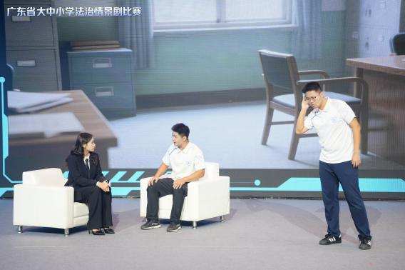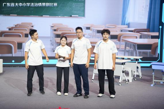 在广州电视台录制的复赛现场。面对其他七支强队的精彩表现,学院团队沉着应战,以高校的课堂为背景,通过学生群体间的矛盾冲突与成长转变,巧妙串联起宪法中关于公民人格尊严、个人信息保护的核心条款,为观众呈现了一堂“沉浸式”法治课。