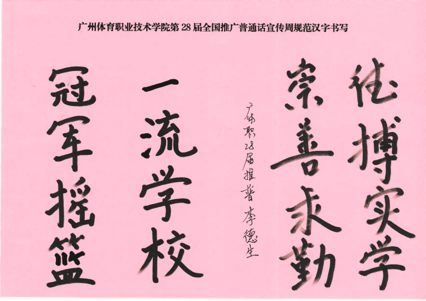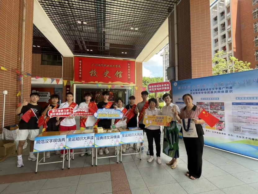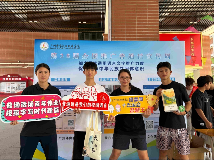 本网讯 9月15日至21日,第28届全国推广普通话宣传周如期而至,适逢第十五届全国运动会筹备工作全面推进之际,广州体育职业技术学院积极响应国家、省、市语委号召,充分发挥体育与语言文化相结合的优势,结合本届活动主题“加大国家通用语言文字推广力度,促进铸牢中华民族共同体意识”,并巧妙地将“推普周”活动与喜迎十五运的氛围深度融合,精心谱写了一曲激情交汇、相得益彰的华丽交响乐,为第28届全国推广普通话宣传周注入了深厚的体育文化内涵。