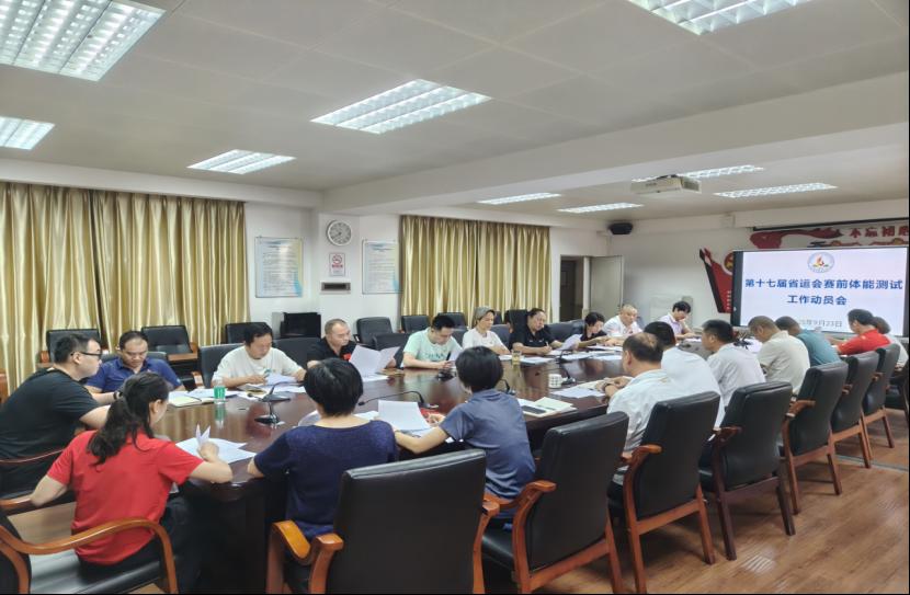 本网讯 2022年9月23日上午,广州体育职业技术学院在西校区训练竞赛处三楼会议室召开广东省第十七届运动会赛前体能测试工作动员会议。学院训练竞赛处、重竞技运动管理中心、体育教育科研中心负责人、各项目专项负责人及总教练、工作执行组全体成员参加会议。