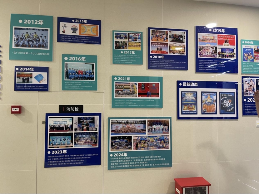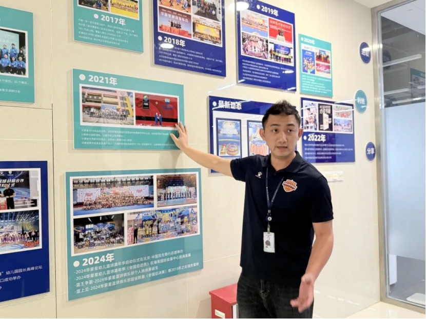 在广州华蒙星体育发展有限公司的发展历程文化墙前,赵华升为来访团队逐一讲解企业的成长脉络。墙上的时间节点清晰展现:2012年企业在广州开设首家少儿篮球俱乐部,正式踏入幼儿篮球教育领域;2014年,主导制定幼儿篮球运动器材标准,填补行业技术空白;2016年,组建专业教练团队,构建标准化教学体系;2018年起,业务版图向全国拓展,逐步成长为幼儿篮球领域的领军品牌。