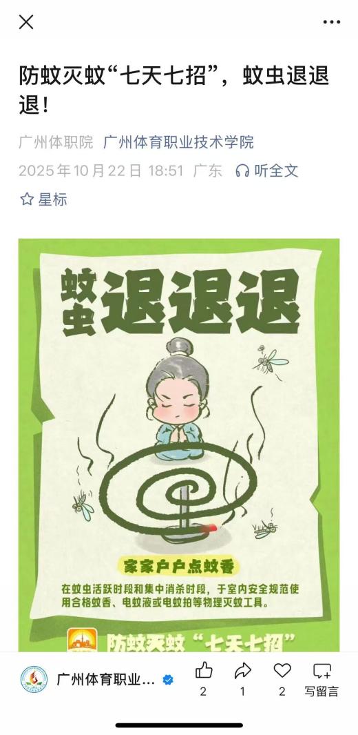 当前正值登革热、基孔肯雅热等蚊媒传染病(“两热”)的高发季节,校园防控工作不容松懈。面对严峻挑战,广州体育职业技术学院在前期有效防控的基础上,对攻坚行动进行再部署、再推进、再强化。学院通过召开专题会议精准部署、组织系列技能培训、深化社区联防联控等举措,将防控网织得更密、扎得更牢,展现了守护师生健康与校园秩序的坚定决心。