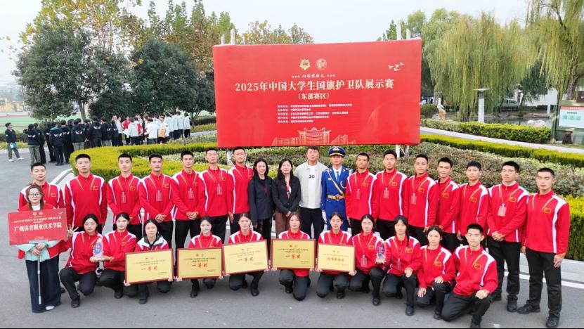 本次比赛汇聚了复旦大学、同济大学、南京航空航天大学、南京师范大学、太原理工大学等多所知名高校。广州体育职业技术学院国旗护卫队24名队员凭借“零失误”的升旗动作和“毫米级”的队列精度,荣获男子组和混编组的升旗展示、队列展示单项一等奖4项,混编乙组团体总分第一名、男子乙组团体总分第二名,实现参赛组别全员晋级全国总决赛。队员们严谨规范的队列素养和昂扬向上的精神风貌,赢得了裁判组的一致好评,成为赛场上一道亮丽的风景线。