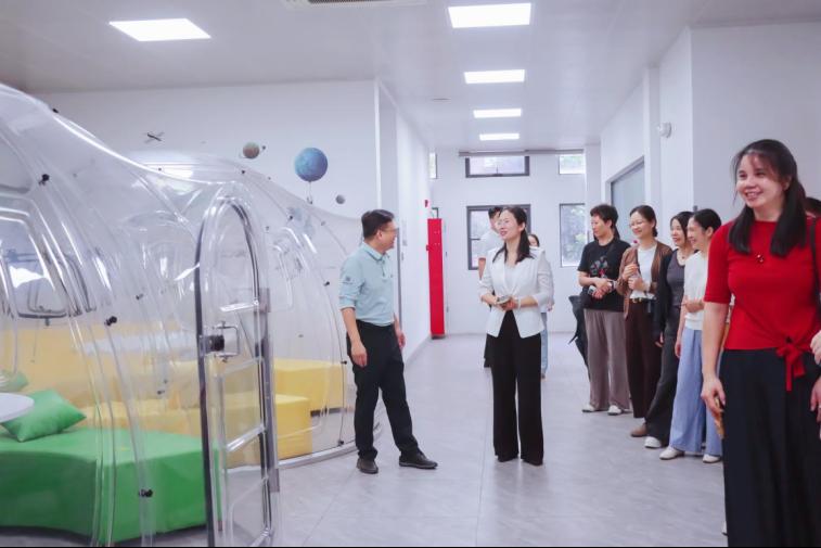 随后,在徐无名校长的带领下,附校教师一行参观了语言教室、音乐室、陶艺室、创客空间、图书馆以及教学楼各层的文化展示区。校园内处处可见以学生为中心的设计理念,浓厚的文化氛围与鲜明的课程特色给附校教师留下了深刻印象。