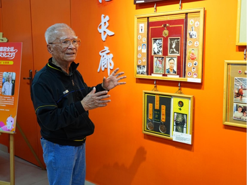 展览现场,1959年第一届全运会技巧竞赛男子双人冠军、学院功勋教练陈斯骥作为核心展品的捐献者,向观众动情讲述了众多珍贵展品背后的故事。他的讲述吸引了在场观众,引发了阵阵掌声。学院张苹副院长也来到现场,与陈斯骥教练共同观展并合影,对他的贡献表示感谢。