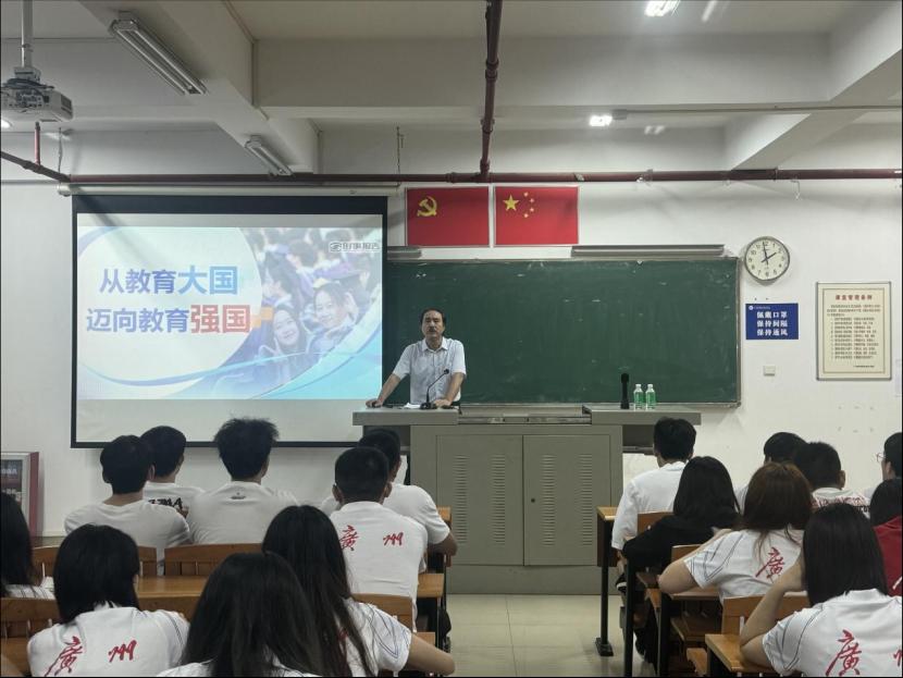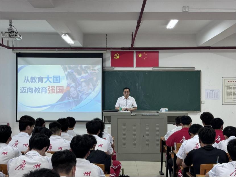 本网讯 为坚持不懈用习近平新时代中国特色社会主义思想凝心铸魂,深入推动习近平新时代中国特色社会主义思想进教材、进课堂、进学生头脑,广州体育职业技术学院党委领导班子成员带头深入思政课堂、走上讲台,就新时代时政热点问题与大学生面对面交流互动,讲授“形势与政策”课。2025年春季学期,党委副书记黄丽仪、纪委书记林昭雄、副院长张苹、副院长崔明分别围绕“从体育大国迈向体育强国”、“从教育大国迈向教育强国”两个专题,结合大学生专业背景和学校发展战略规划,在教学大楼多媒体课室为各系各年级、专业四个教学班级的300多名师生系统阐释了体育强国和教育强国建设的道理、学理和哲理,让党的创新理论融入课堂、“声”入人心。
