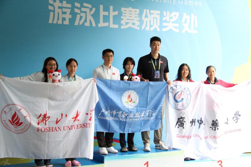本次比赛在学院领导关心重视下,得到体育运动系、体育产业系、体育保健与康复系以及学员相关部门的大力支持,游泳代表队领队由体育运动系主任担任,五位专兼职教师为教练员,团队秉持“崇德、善搏、求实、勤学”校训精神,积极迎战,队员们赛出了风采,将校训精神具象化。赛场上,队员相关鼓励加油,呐喊助威,分析对手,学习对手,激励自己。在乙A组女子100米仰泳比赛中,广州体职院学生杨雯靖以预赛成绩第二名进入决赛名单,经过激烈比拼,最终荣获冠军。