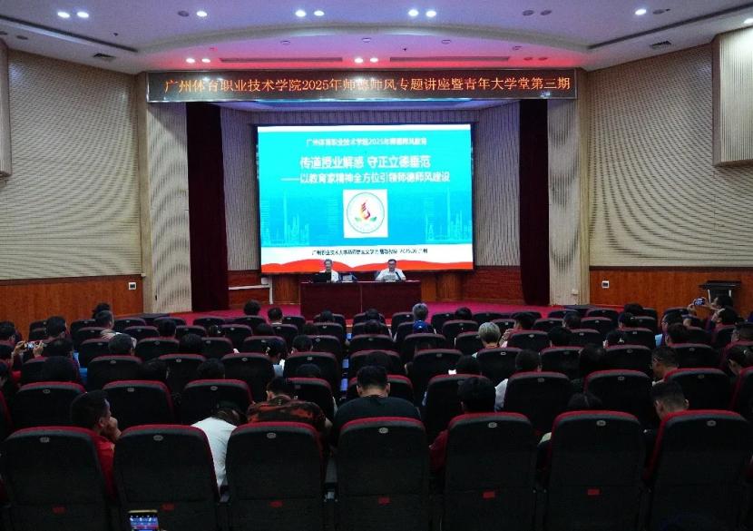 本网讯 为深入学习习近平总书记关于教育的重要论述以及对教师工作的重要指示批示精神,大力弘扬教育家精神,切实加强教师队伍师德师风建设,9 月17日下午,广州体育职业技术学院在西校区阶梯会议厅开展2025年师德师风专题讲座暨青年大学堂(第三期)。本次讲座特邀广州职业技术大学马克思主义学院党总支书记、教育部全国高校思政课名师工作室负责人、“全国高校黄大年式教师团队” 领衔名师、广东省教学名师曹群教授主讲,讲座由学院党委委员、纪委书记林昭雄主持,学院全体教师(教练员)及组织人事处、教务处、学生处、团委、继续教育部、技能实训中心全体人员参会学习。