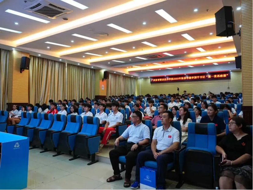 本网讯 9月26日上午,广州体育职业技术学院党委书记、院长李国平以“赓续抗战精神,勇担强国使命”为主题,在学院图书馆一号报告厅为师生代表讲授2025年秋季学期“第一堂思政课”。2023级、2024级部分高职学生、思政课教师和辅导员共同参加学习。