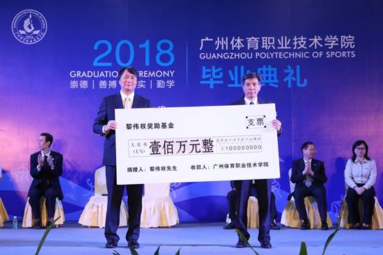 典礼上,广州康威集团体育用品股份有限公司董事长、学院校友会会长黎伟权先生发表致辞。他首先祝贺2018届学弟、学妹们顺利毕业,鼓励他们走向社会后努力奋斗、勇往直前,用青春的热血挥洒属于自己的精彩。作为学院“黎伟权校友奖学金”创立人,黎伟权先生在原来向学院捐赠100万的基础上,今年再向学院捐赠100万元,用于奖励优秀的学生、运动员、教师、教练和资助贫困学生。随后,孔茂胜书记代表学院接受黎伟权校友捐赠并颁发证书。