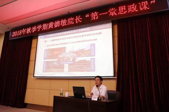 本网讯 9月26日上午,在图书馆1号报告厅,学院院长、党委副书记黄德敏新学期“第一堂思政课”开讲。2018级200多名新生;体育运动系、体育产业系、体育保健与康复系、公共基础课部、思想政治理论课教学部书记、全体辅导员、思政课教师及办公室(党办)、组织人事处、宣传处、学生处、团委等部门负责人聆听了第一堂思政课。