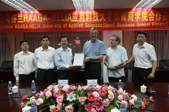 2014年,我院与芬兰哈格赫利尔应用科学大学体育商学院合作开办体育运营与管理专业(体育与休闲管理方向),实施“2+1+1”专本衔接,学分互认,这是芬兰在中国首个国际合作办学项目,也是我国体育职业院校首个国际合作办学项目,该项目得到芬兰驻我国大使馆教育与科学参赞狄明嘉和中国驻芬兰教育参赞高宇先生的高度评价。