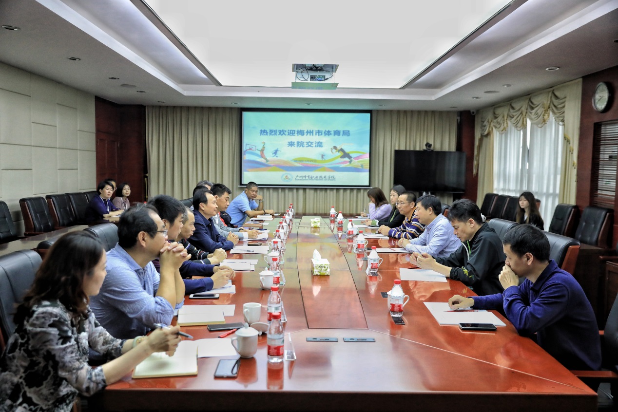 本网讯 2019年3月29日上午,梅州市体育局陈建新局长带队一行到广州体育职业技术学院参观调研。广州市体育局副局长吴民春、竞技体育处副处长裴伟民、学院党委副书记兼纪委书记林彬、办公室(党办)、宣传处、训练竞赛处、总务处、科研中心、医务所、附属学校及广州市体育科学研究所等相关负责人参加了调研座谈会。