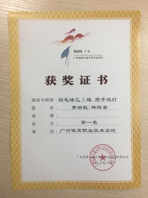 1、男子双打冠军(该项目连续三年获得冠军);(黄瑞乾、林晖景 )