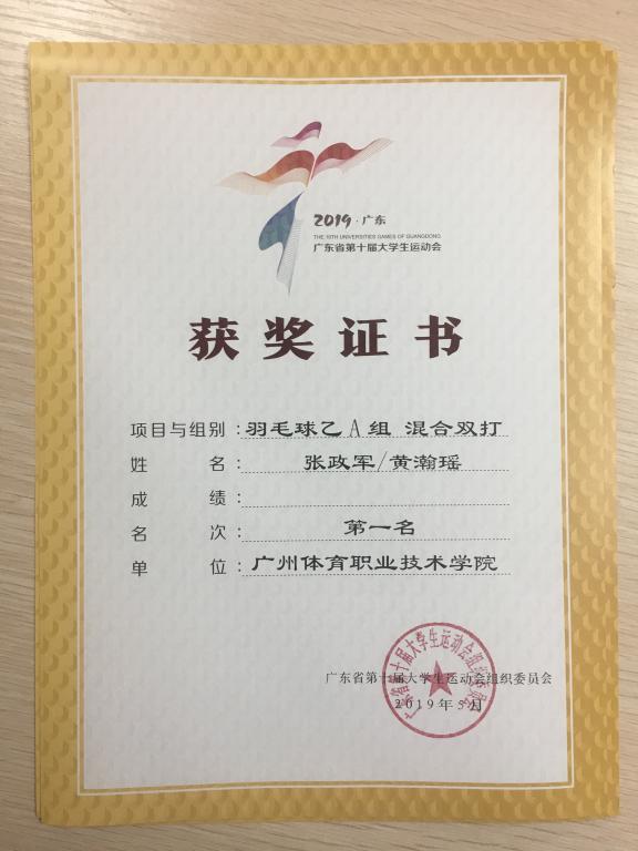 2、混合双打冠军(首次获得);(黄瀚瑶、张政军)