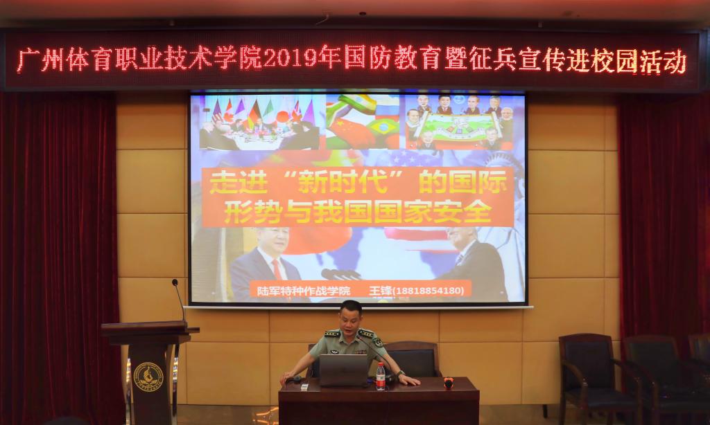 首先,由王锋上校做了《走进“新时代”的国际形势与我国国家安全》的精彩报告,讲述了近期国际和我国目前面临的安全形势,以及中美贸易战对我国的影响。我们提高政治站位,把国家安全与大学生征兵工作有机结合起来,把大学生征兵工作作为高校青年学生工作的重要内容;最后由广东司法警官职业学院退伍学生刘芬秀与大家一起分享了她的军旅难忘经历。