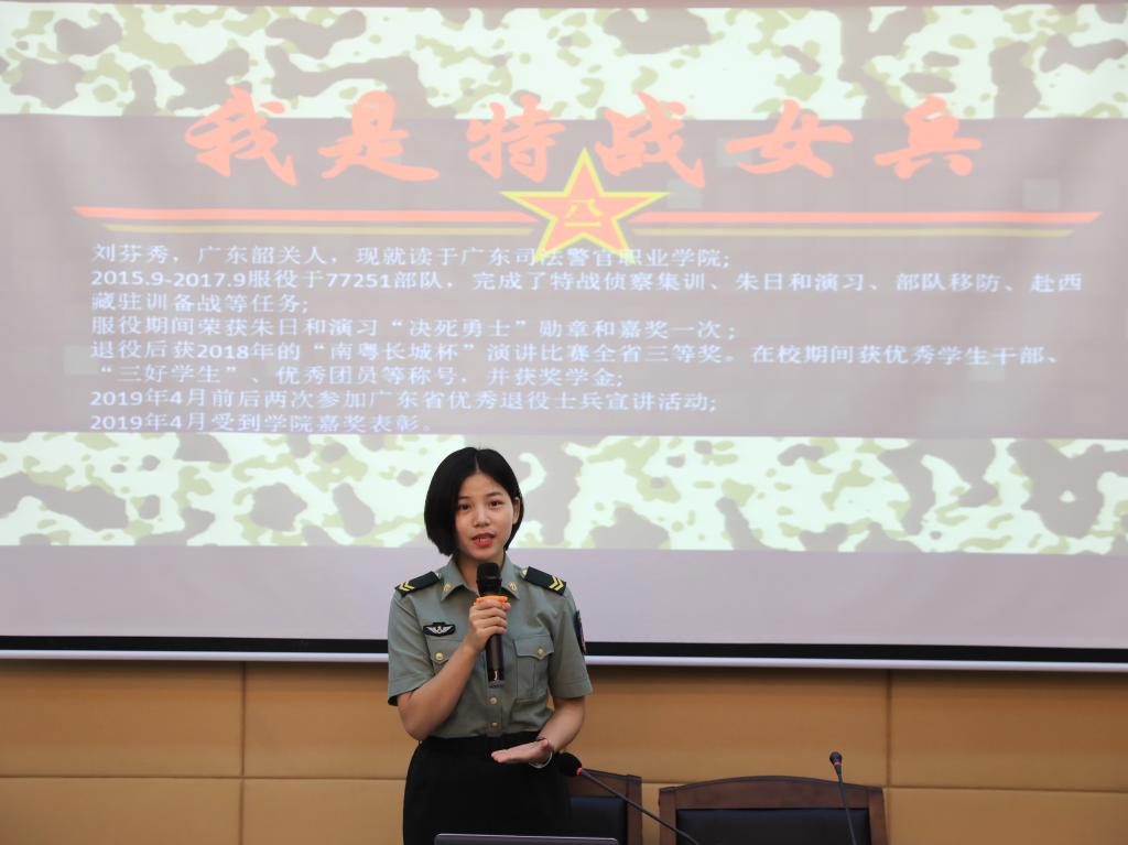 本网讯 为深入贯彻落实教育部、中央军委国防动员部召开的2019年全国大学生征兵工作网络视频会议和省委议军会议精神。5月30日晚,我院在1号报告厅举行2019年大学生征兵宣讲会。中国人民解放军陆军特种作战学院军事共同教研室副教授王锋上校、天河区武装部侯雨辰参谋、天河区公安分局宋澈警官、广东司法警官职业学院退伍学生刘芬秀、学生处老师及三系学生近200人参加了会议。会议由学生处副处长邓娉主持。