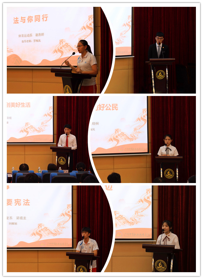 比赛过程中,来自体育运动系、体育产业系和体育保健与康复系的参赛选手依次出场,围绕“学宪法讲宪法”活动主题,结合自身实际,作了5分钟的主题演讲。他们有的以1954年第一部宪法的诞生为切入点,有的以最近热播的电视剧为例子,有的用顺口溜来讲述如何践行宪法,有的把宪法精神和冠军精神结合起来进行论述,有的关注农民工问题,有的通过网络暴力的例子来说明问题。充分展示了青年大学生在学习宪法知识,弘扬宪法精神,树立宪法权威过程的立场态度和聪明才智。