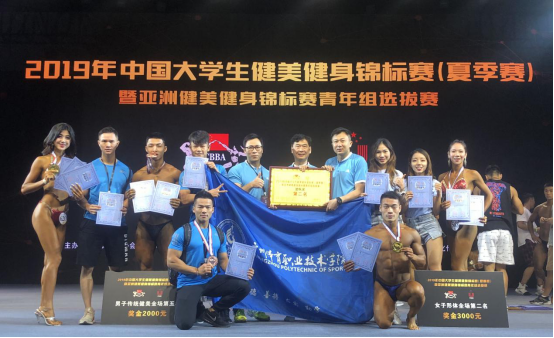 我院由体育运动系党支部书记黄建新担任领队,黄晓强、罗飞担任教练,9名学生参加了古典健美、传统健美,男子健体,女子形体,比基尼健身、健身小姐、体育健身模特共7个项目9个组别的比赛。经过激烈角逐,在学院“冠军精神”的指引下,我们赛出风格,赛出水平,异军突起!获得2个单项冠军,1个全场冠军赛亚军,1个单项亚军,2个单项季军,1项女子健身模特最佳模特奖,所有选手进去决赛并获得名次,力压众多代表队,获得团体总分亚军的优异成绩。其中17级社体专业学生谭诗仪以女子形体全场冠军赛亚军的成绩入选中国国家健身健美队,获得参加2019年亚洲健美健身锦标赛青年组的参赛资格。