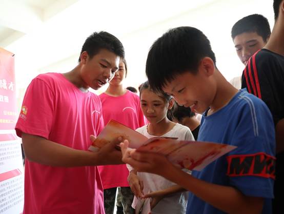| 我院旗帜飘扬“三下乡”服务队队长钟浩球在向学生进行政策宣传 |