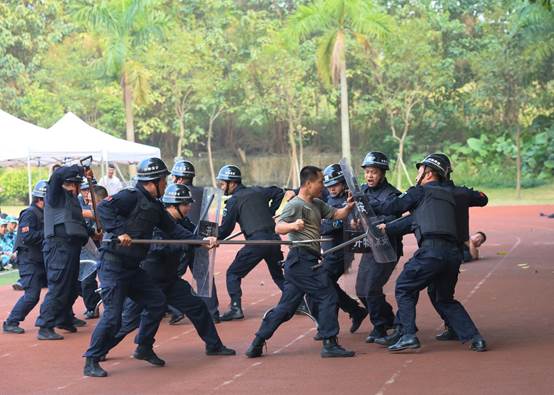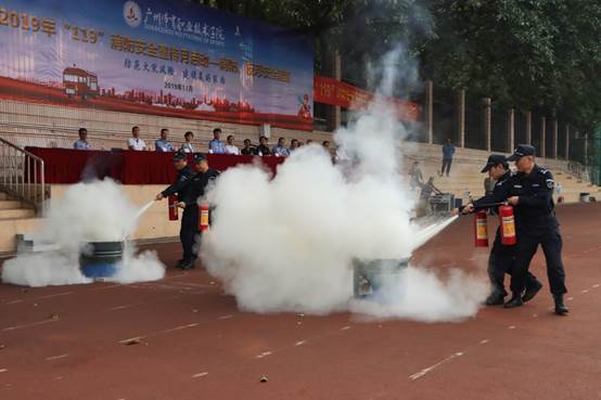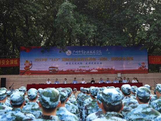 本网讯 11月15日下午三点,广州体育职业技术学院“119”消防安全月活动——消防反恐安全演练在东区田径场举行。广州市体育局产业处副处长陈萱宁、市体育局产业处傅玉斌、广州市内保支队大队长张松华、广州市天河公安分局林茂华、长兴街道副主任林媛、长兴派出所副所长陈乙欢、建丽社区党支部书记兼居委会主任万海林、开物保安公司副总经理陈顺辉、学院副院长李国平以及相关部门负责人,全体高职新生、辅导员、医务人员参加了活动。