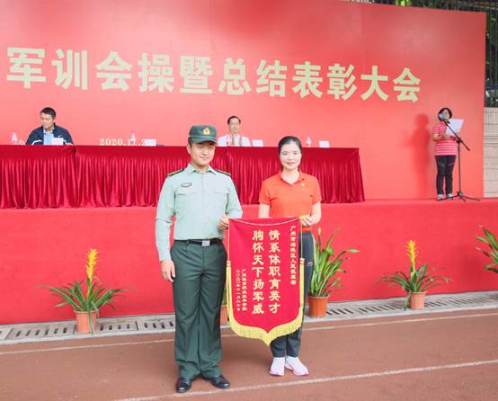 汇演结束后,学院表扬了优秀标兵105人、优秀军训教官3人、优秀军训辅导员1人以及10个先进集体。为表示对承训单位和全体参训教官的感谢,学院党委书记谭爱英向承训单位赠送了锦旗。