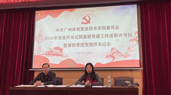 本网讯 2021年1月8日下午,中共广州体育职业技术学院委员会2020年度党组织书记抓基层党建工作述职评议考核会议暨第四季度党组织书记会议在东校区图书馆一号报告厅召开。党委书记谭爱英,党委副书记、院长李国平,各党总支书记、直属党支部书记,全体组织员,“两代表一委员”及基层党员干部群众代表参加了本次会议。会议由党委副书记、院长李国平主持。