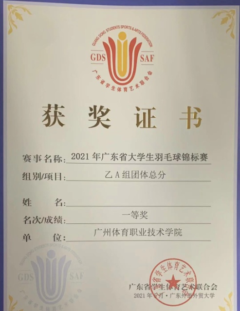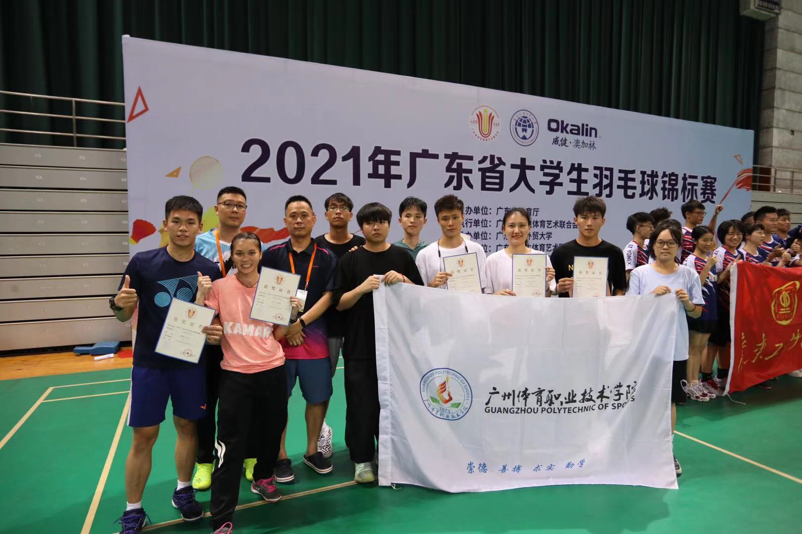 5月14至17日,2021年广东省大学生羽毛球锦标赛在广东外语外贸大学(南校区)体育馆举行。广州体育职业技术学院羽毛球队在来自全省100多个学校的124支队伍,共计1500多名运动员中突出重围,经过4天激战,获得混双第一名、混双第四名,男双第六名的优异成绩。团体总分排名第三,获得团体总分一等奖,以优异成绩迎接党的百年华诞!