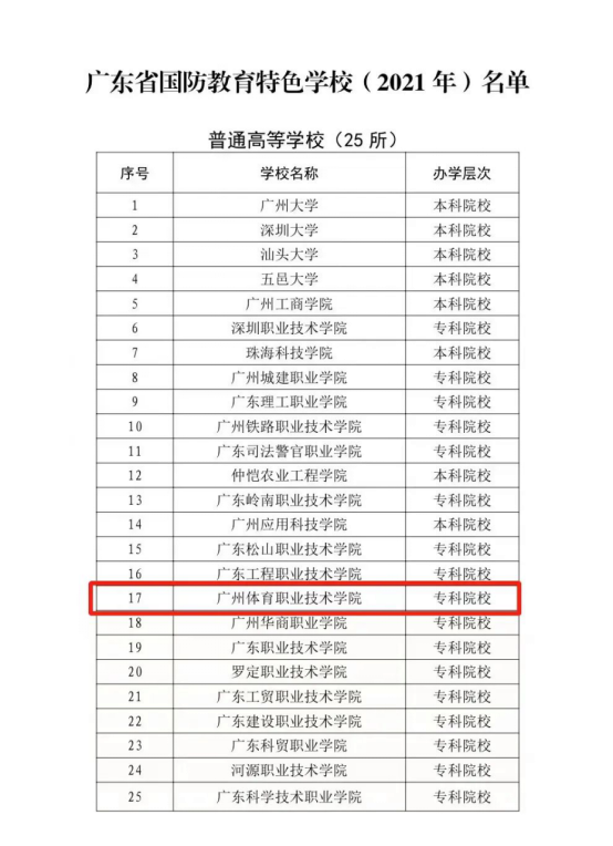 本网讯 近日,广东省教育厅公布了《广东省国防教育特色学校名单的通知》,确定86所学校为广东省国防教育特色学校,广州体育职业技术学院成功入选。