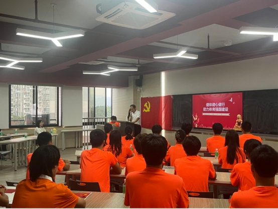 本网讯 为激励同学们的爱国热情,以实际行动助力体育强国建设,11月8日下午,广州体育职业技术学院体育运动系辅导员朱竟胜老师、思想政治理论课教学部陈利老师和班主任张志斌老师与2020级五年制3班学生共上“健体健心健行,助力体育强国建设”主题班会课。学生处处长黄克铭、体育运动系书记余红斌、学生处副处长彭凡及全体辅导员观摩了这场主题班会,并就如何深化思想教育内容、牢牢把握健康心理正确导向,引导学生既怀爱国之情,又树报国之志等方面进行了深入的研讨。