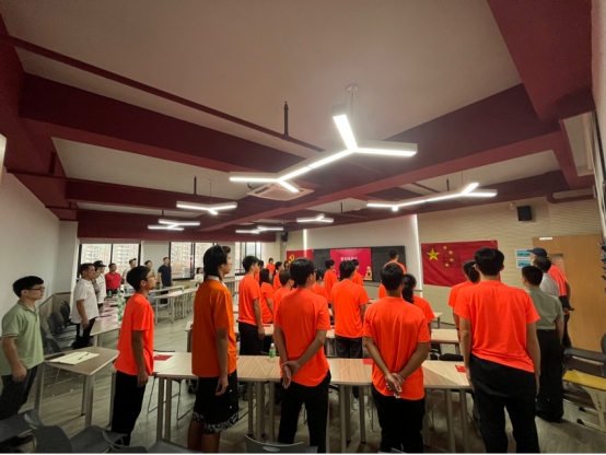 第二个环节,奏唱国歌。随着雄壮的《义勇军进行曲》响起,全体面对国旗肃立,行注目礼,并怀着崇高的敬意和无比的自豪高唱国歌,气氛庄严而肃穆。全体人员精神振奋,鲜艳的五星红旗,点燃了大家心中的爱国之情,震撼回响的国歌,激发出大家的责任感和奋进豪情。